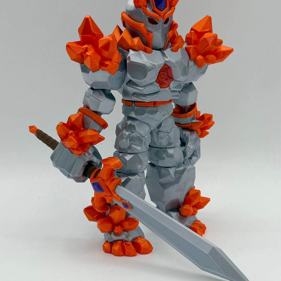 Forged from stone and powered by glowing crystal energy, the Crystal Golem stands ready for battle. This striking 3D printed fantasy creature features rugged stone armor, brilliant orange crystal formations, and a powerful sword—making it a bold centerpiece for any fantasy collection.